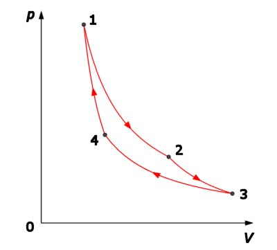 Substanţa de lucru (un gaz ideal) primeşte căldură izoterm la temperatura ridicată T1 şi cedează căldură izoterm la temperatura mai coborâtă T2.